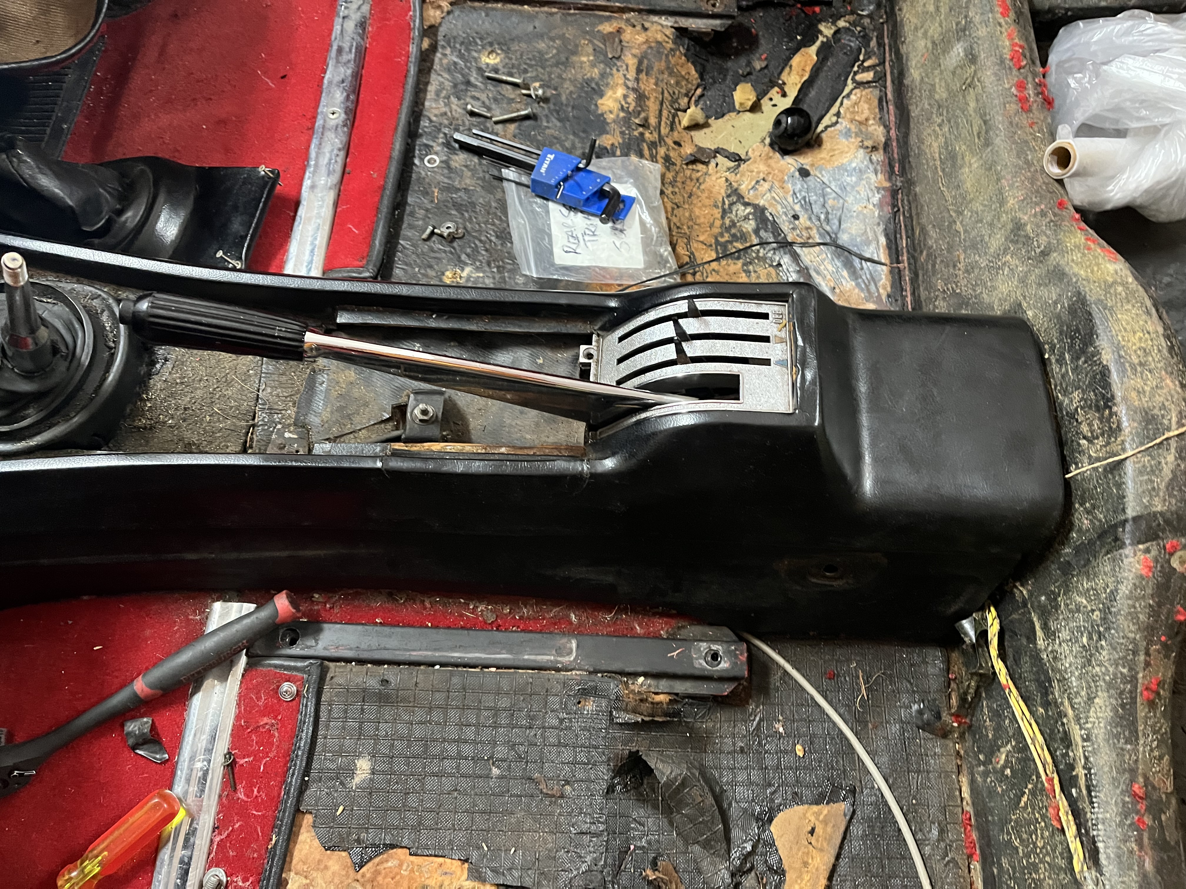As you can see in the pic I’m completely stripping the car. I’ve undone the console screws and bolt at the dash, remove the 2 screws on the heater control, and of course the seat belts. But I can’t figure out how to lift the rear end to pull it out. I can see a 10mm nut thru the heater control that may be a rear bolt down. But how do you get at it. From the look of the console at the heater control, someone tried leavering out the heater control in the past and messed up the moulding.