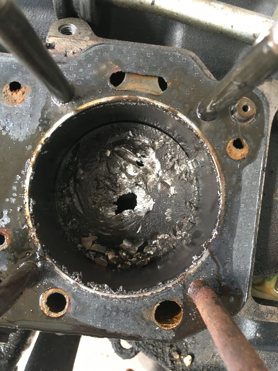 Pulled the engine this afternoon, and I could take a closer look at the damage on cylinder 5 and 6, they have taken some serious beating..