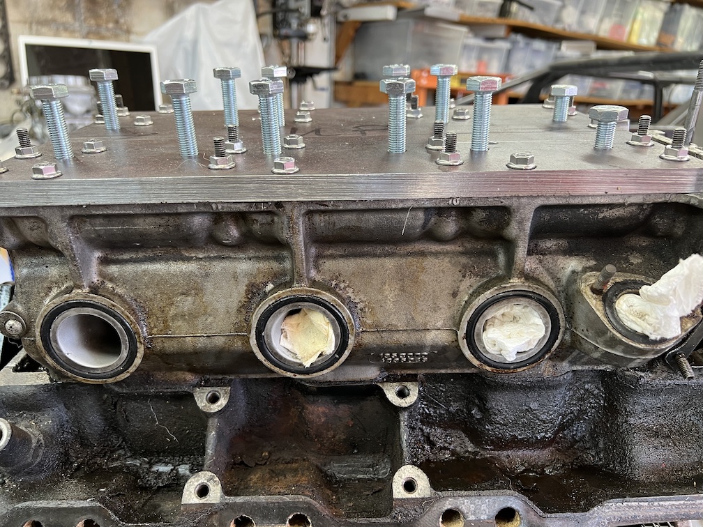 Note that...main reason for removing the engine is coolant seen in the oil when draining it (chocolate milkshake look), water vapour in the oil fillers when hot, oil analysis finding antifreeze components in the oil. And I had seen coolant in the #6 cylinder sparkplug well, so I had reason to believe the Left cylinder head (4,5,6) was the problem.