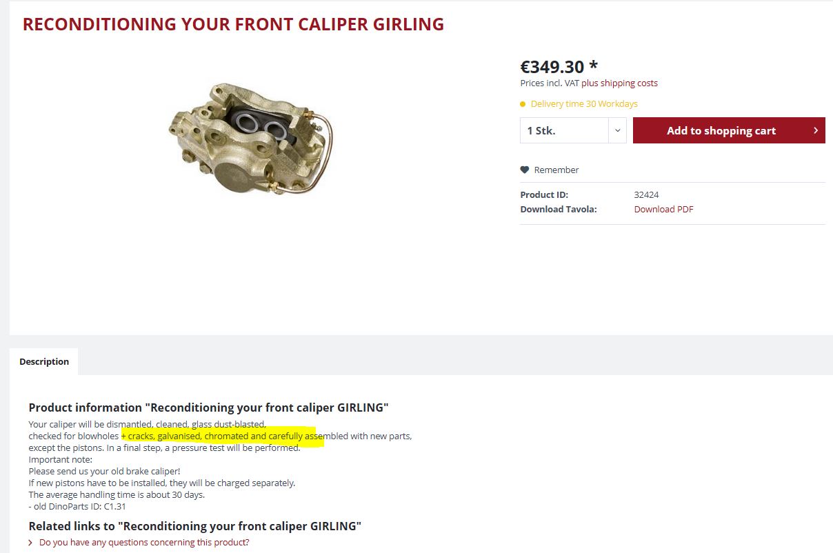 For example, at Dinoparts (the largest spare parts dealer for Fiat & Ferrari Dino in Germany) they will recondition your Girling brake calipers that will be galvanized and (yellow) chromated