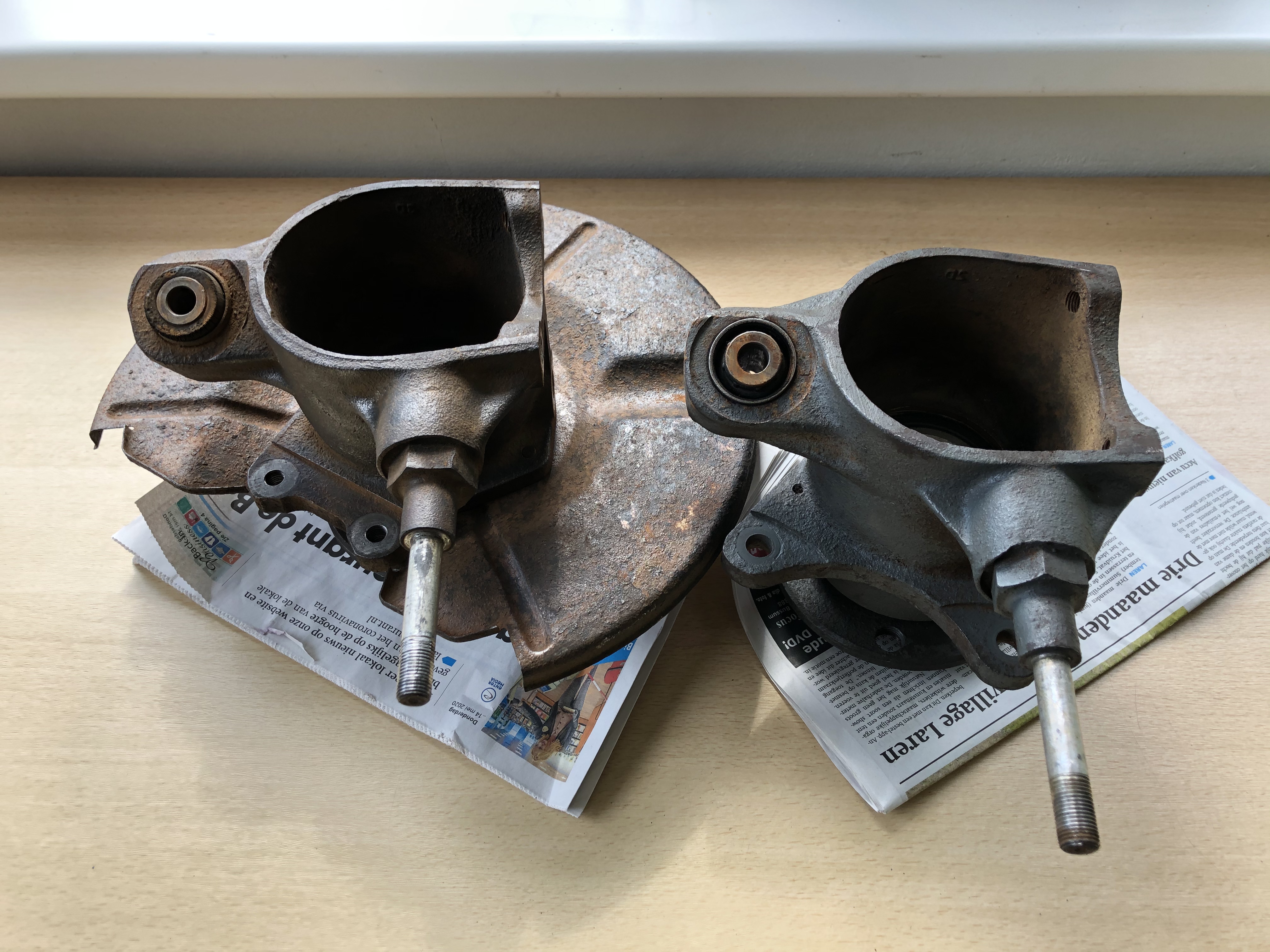 First we got some substandard quality ones, before receiving some very nice ones from Dinoparts. The real fun started when we found out two of the five holes (and original wheel) on the right rear were drilled out to a bigger size. Drilling out the brand new wheel to a bigger size was off course a definite no go, as you can imagine! So I got a wheel bearing carrier with hub with stock treads. See if you can spot the difference from the attached picture. I didn’t notice until I tried mounting the brake caliper!