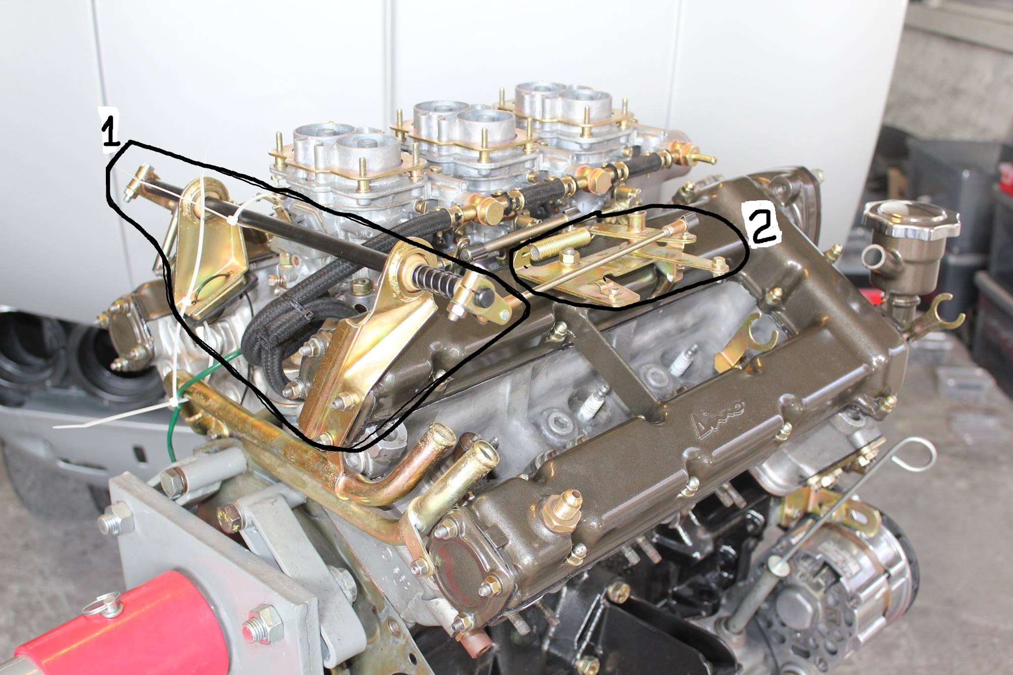 2 Accelerator lever mounted on top of valve cover (RHS of carbs)