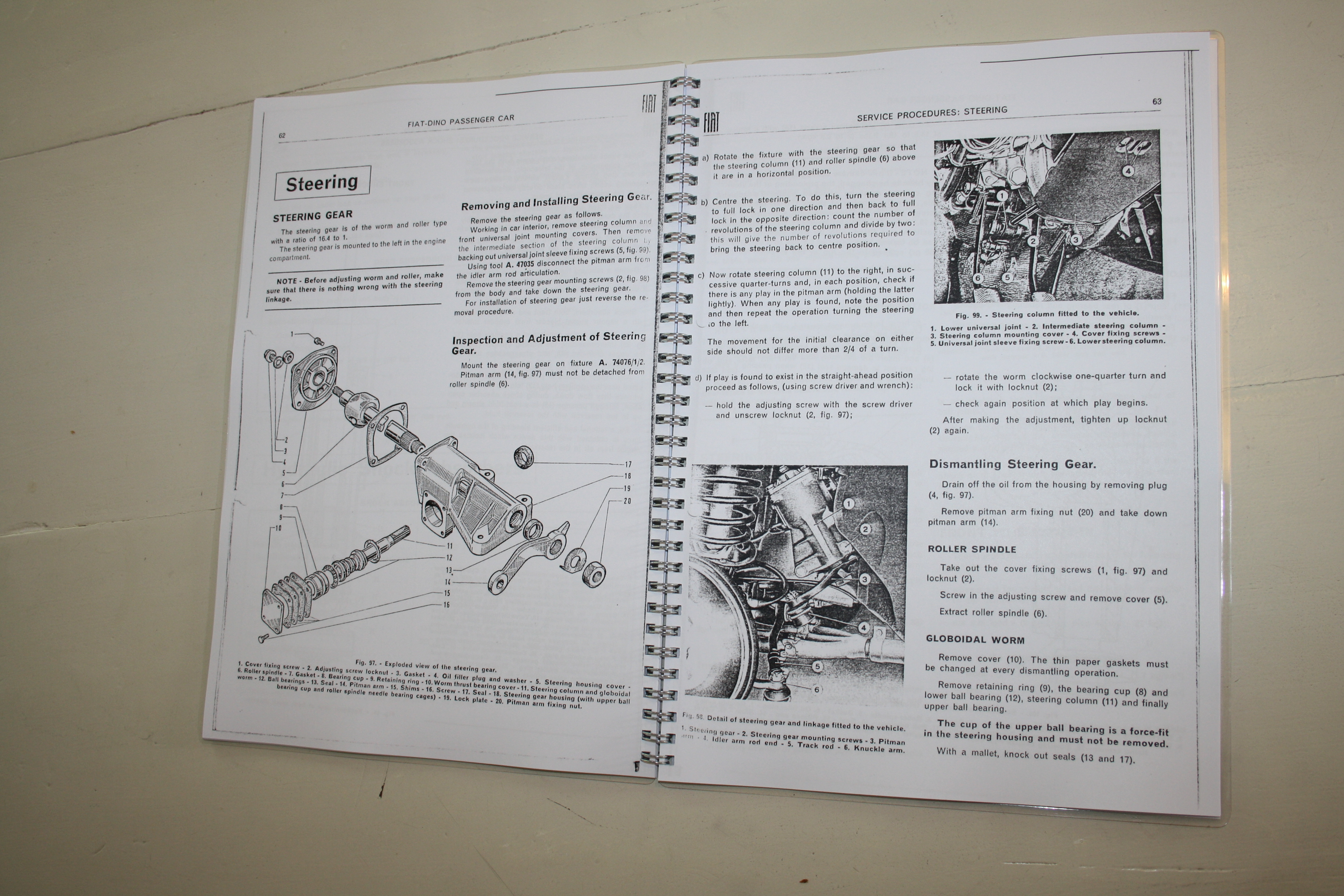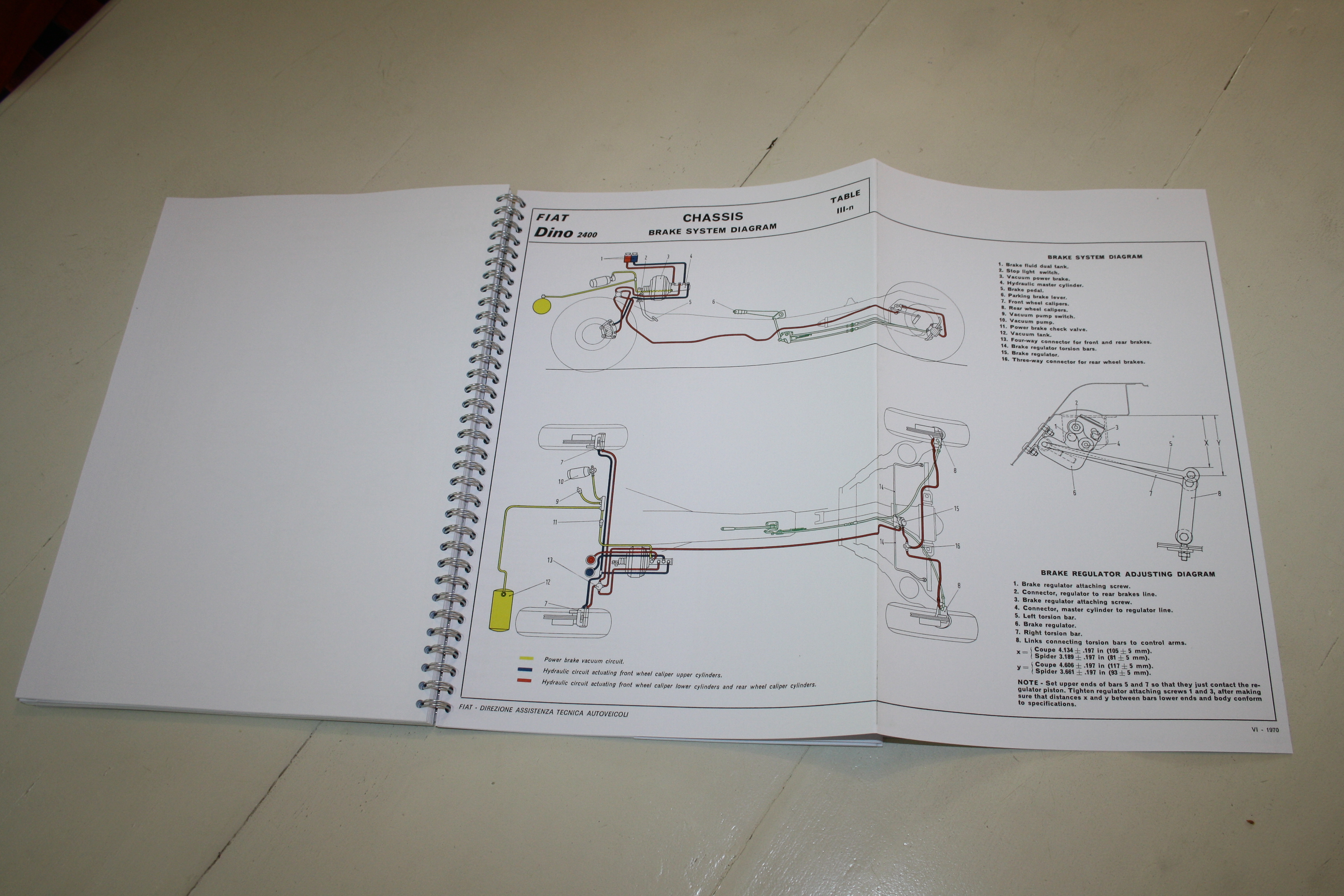1. Fiat Dino (Roadster + Coupe) - specifications and features, servicing instructions. (Workshop manual, printed from a scan) 2. Fiat Dino 2400 Specifications and features ( technical details, with exploded views, wiring schemes, various outfoldable drawings in color) (copied from original; very sharp and good quality)