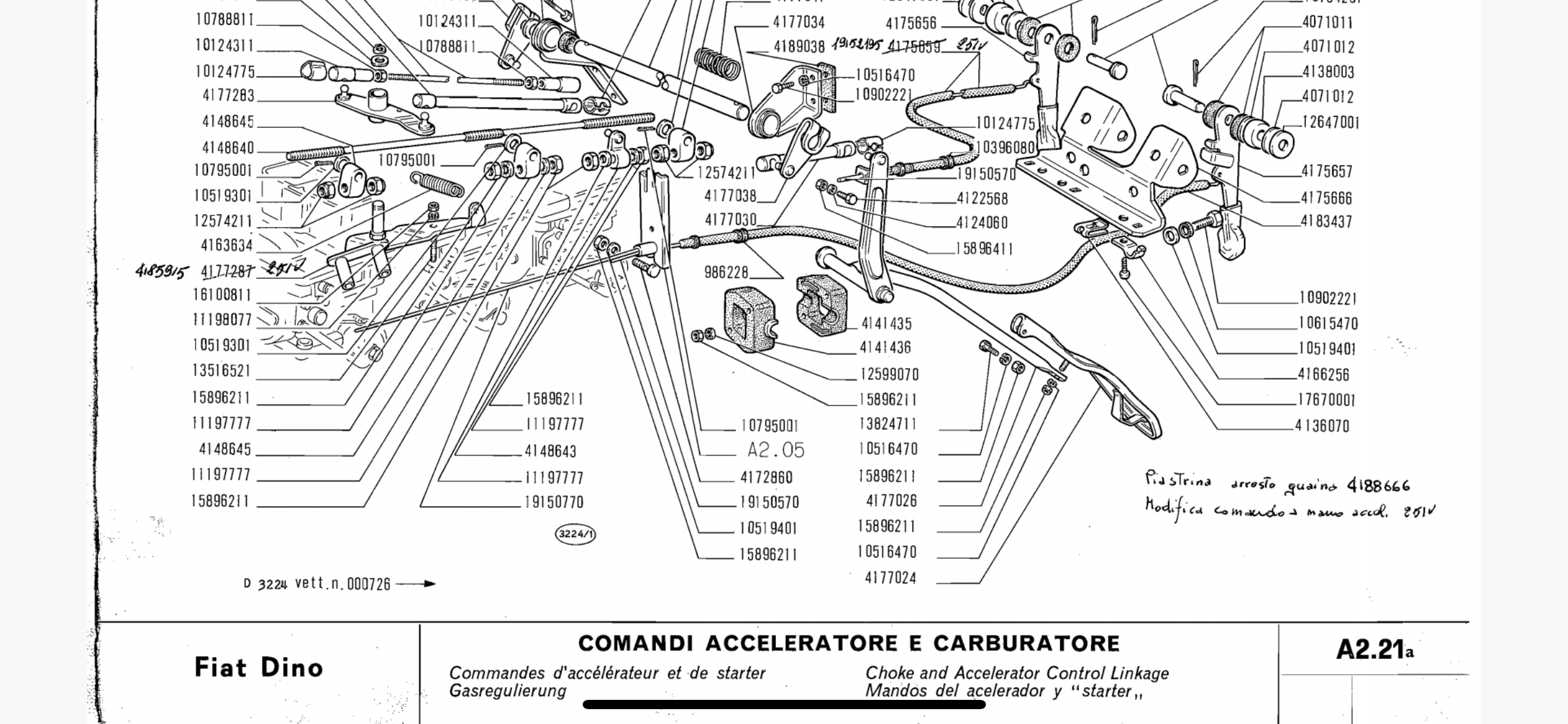 I own a 1968 Fiat Dino Spider 2000, chassis #903. The car is nicely original, with just a couple of parts to be sorted. A previous owner has removed the choke / manual throttle unit which I am now fitting back. I need to to find the correct levers, bracket & fitment location.