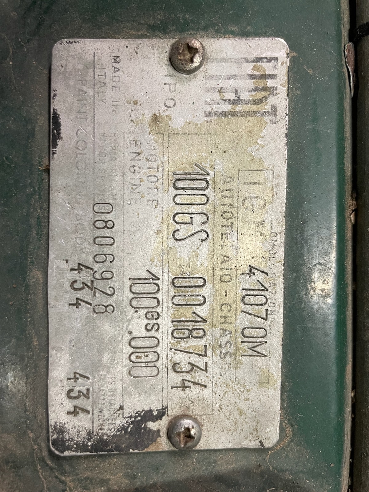 Three of the images are Chassis, Ricambi, and engine numbers. One image is someones idea of simplifying the import process by using a Fiat 850 ID tag.