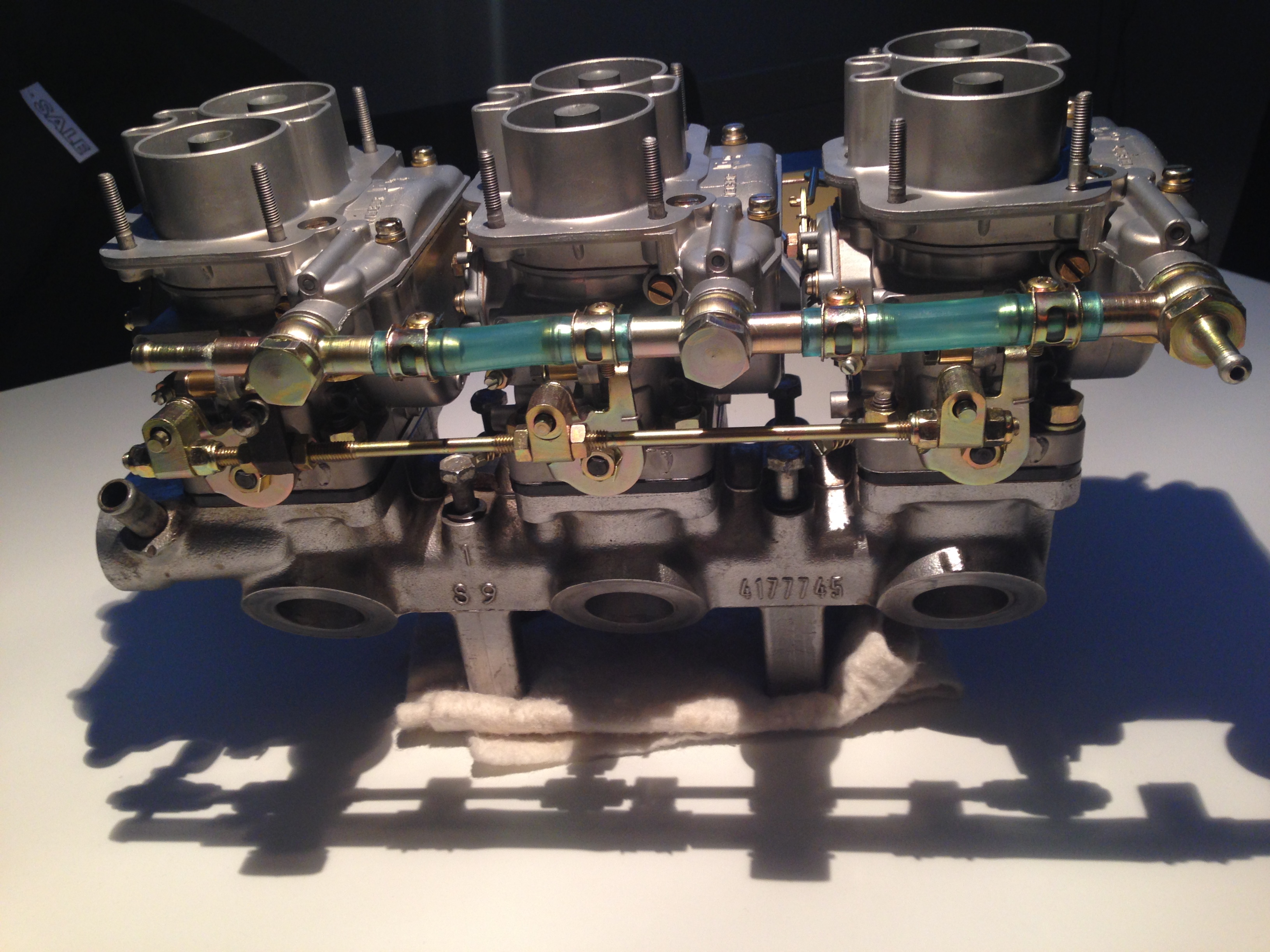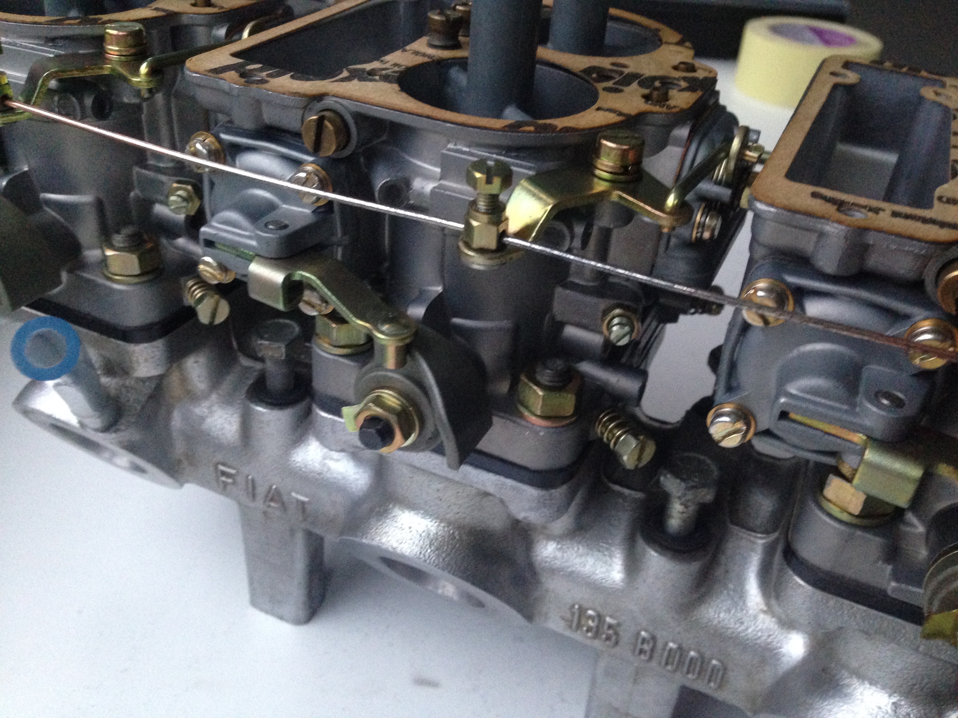 We started it two weeks ago and fuel poured out of the front carb behind the choke cover, so of it went again... Took it apart (choke etc.), nothing to see. So back on to check the fuel pressure. We just checked it, fired up right away and the fuel pressure exactly on point and no leaking carb... Well sort of, the middle one weeps from the top cover, put not pouring out. I just don't get it, it just doesn't want to not leak at all.