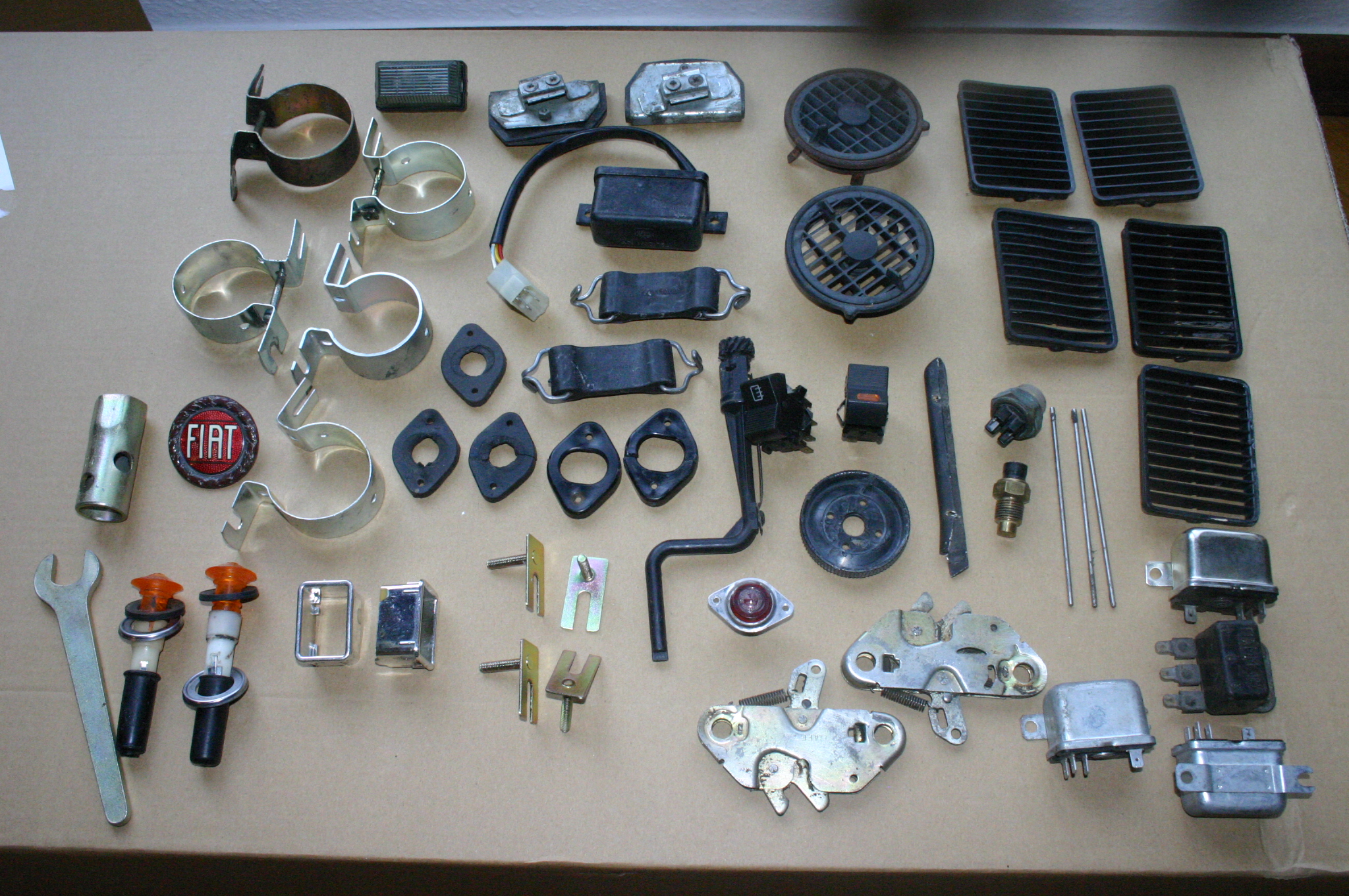 Original Sipea relays, Spider air intake plastic grills, water temperature sensors, Spider sill trim retaining clips, Spider trunk light housing, grommets, bonnet lid locks, Coupé dashboard vents, Coupé window emergency crank, side marker complete, brackets for horn compressor and ignition coil, wiper intermittent relay, etc.Spider door trim (not on photo).