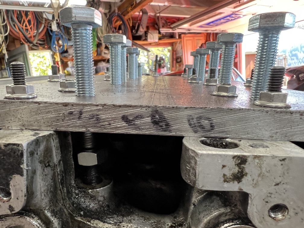 Note: the nuts on the head studs were an attempt to protect the threads in case of misalignment, but they were a problem - later removed and started again.